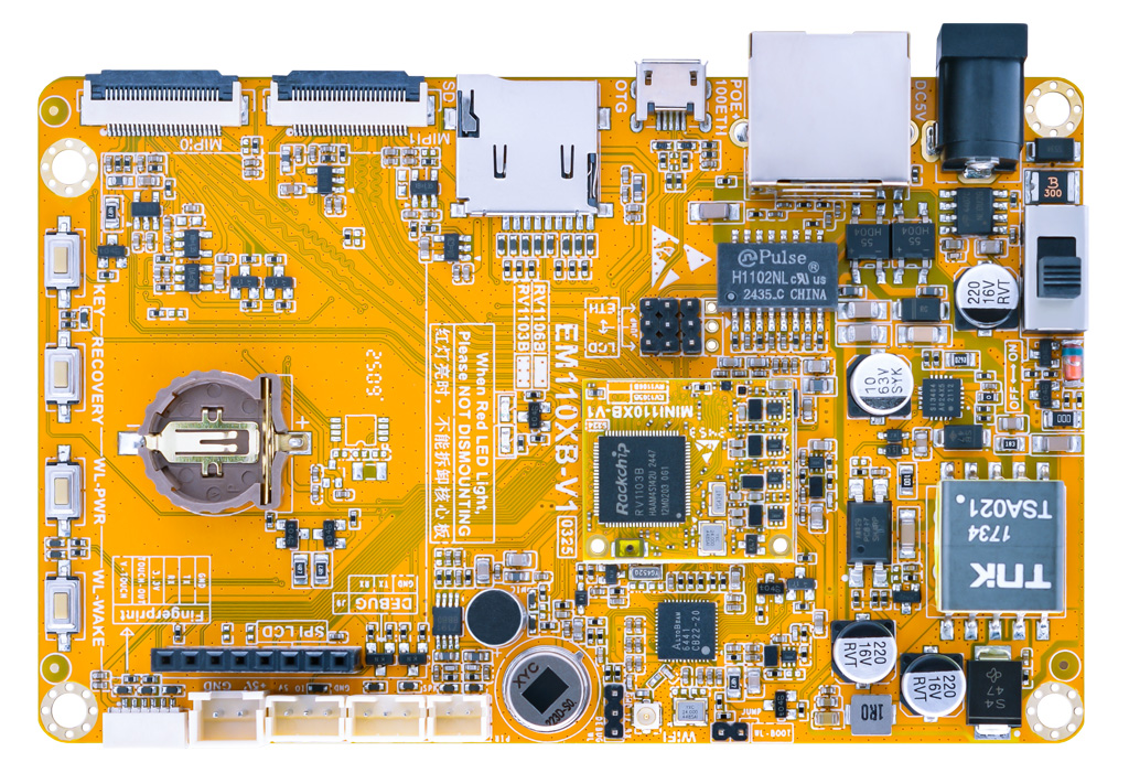 Designed for flexibility, the EM1103B offers dual 2-lane MIPI camera support, a micro SD slot, 100M Ethernet, Wi-Fi, speaker, and mic interfaces. Unique features include a fingerprint sensor interface (compatible with FPM383C modules) and an onboard PIR sensor for motion detection. Power-over-Ethernet (PoE) support (5V) simplifies deployment in surveillance and access control systems.