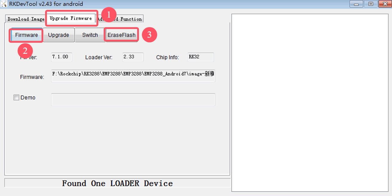 Step 4, click Upgrade Firmware -> Firmware, select update.img, click EraseFlash to erase flash. After erase flash will enter Maskrom mode.